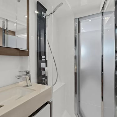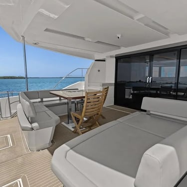 Designed for entertaining and relaxation, this yacht features an expansive flybridge with premium teak dining tables, plush seating, and panoramic ocean views. Her 25+ foot dual-hull design ensures an exceptionally smooth and stable ride — delivering comfort that traditional monohull yachts simply can’t match.
